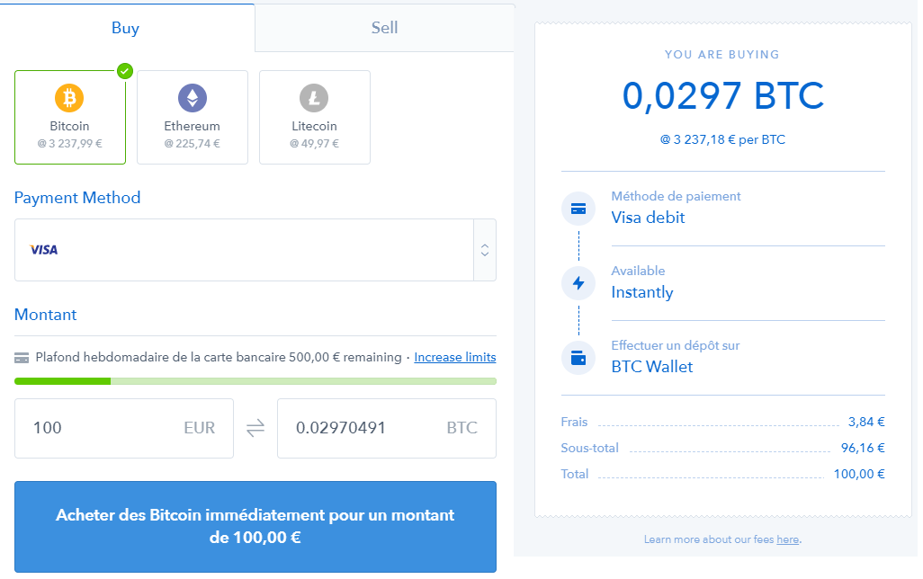 Il existe deux méthodes de paiement sur Coinbase : La Carte Bancaire et le Virement SEPA. La première méthode est instantanée, mais a des frais plus élevés (4%) et le plafond d'achats est limité à 500€ par semaine. Alors que la seconde méthode prend plusieurs jours (4 à 5 jours ouvrés en moyenne) mais n'est soumise qu'à 1.5% de frais, avec une limitation à 9.000€ par semaine.