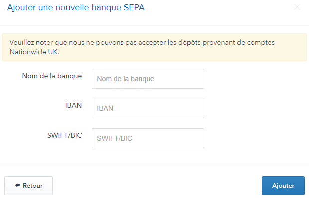 Complétez les informations demandées par Coinbase. Le nom de votre banque, votre IBAN et le code SWIFT ou BIC. Ce dernier permet d'identifier votre agence bancaire, vous pourrez le trouver sur votre Relevé d'Identité Bancaire.