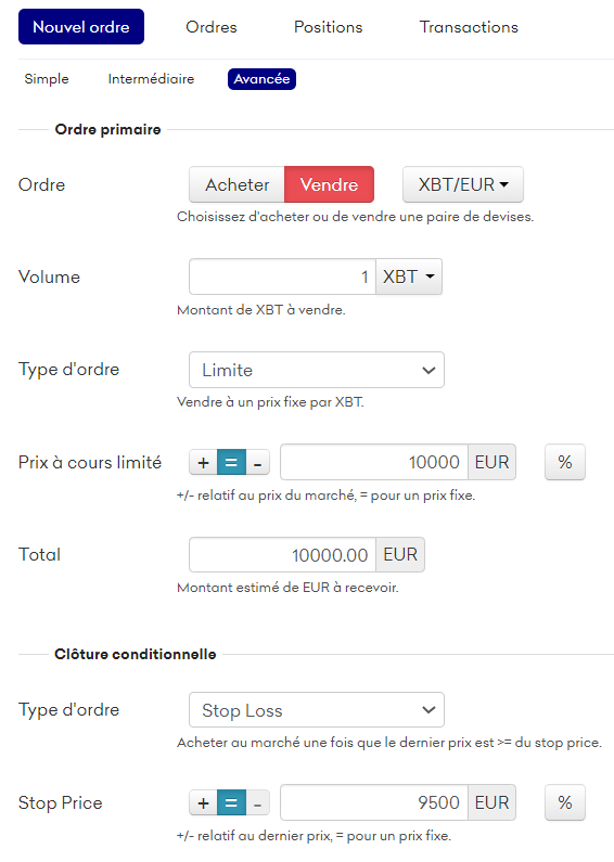 En cliquant sur l'onglet "Avancée" de Kraken, vous pouvez choisir "Limite" dans la case "Type d'ordre". Ensuite dans la partie "Clôture conditionnelle", il vous suffit de mettre sur "Stop Loss". Par exemple sur la capture ci-dessous, je place un ordre de vente à 10 000 € et un stop loss se déclenchera si le cours descend en dessous de 9 500 €. Le tout dans un seul et même ordre 🙂