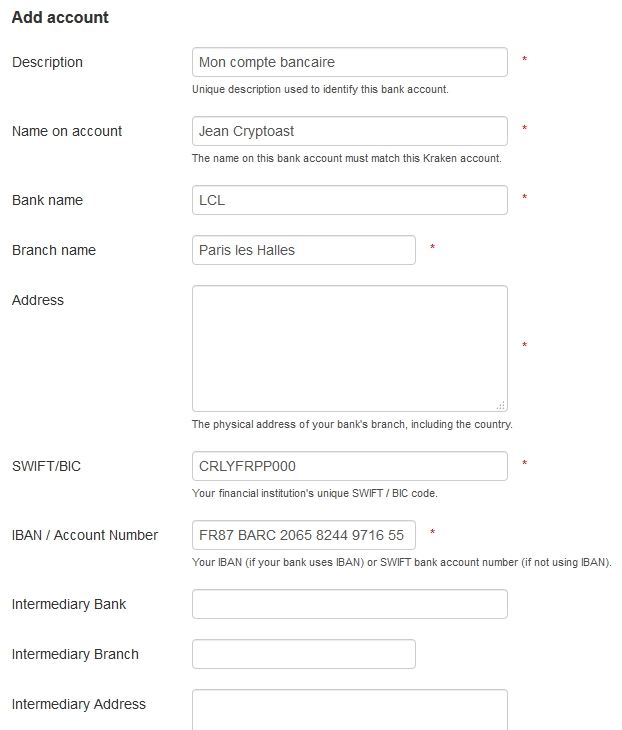 Pour ajouter votre compte bancaire sur Kraken, vous devez cliquer sur "Add account", comme vu plus haut. Il vous sera ensuite demandé de compléter un formulaire. Vous pouvez mettre ce que vous souhaitez dans le champ description, il vous sert seulement à différencier ce compte pour pouvoir le sélectionner facilement sur la page précédente lors de vos prochains retraits. Renseignez ensuite les informations suivantes, celles-ci sont présentes sur votre RIB. Les champs Intermediary sont facultatifs.