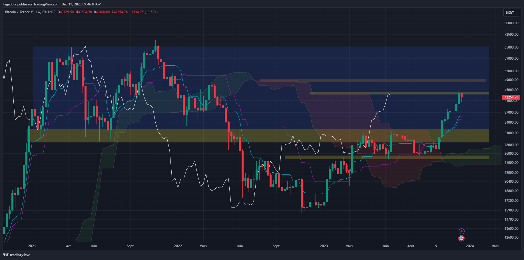 Une fin d'année rouge donc pour le Bitcoin ? C'est ce qu'il semble se profiler, avec la Tenkan (en turquoise) et la Kijun (en violet) qui sont actuellement très éloignées du prix. Dans ce contexte, le prix a donc de grandes chances de se diriger vers ces deux supports à 35 900 $ voire 34 900 $.