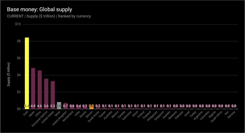 La première place est évidemment, et de loin, attribuée à l'or. Afin de dépasser sa capitalisation il faudrait que le BTC atteigne les 460 000 dollars. Un prix impressionnant qui propulserait la crypto à la première place des valeurs monétaires.