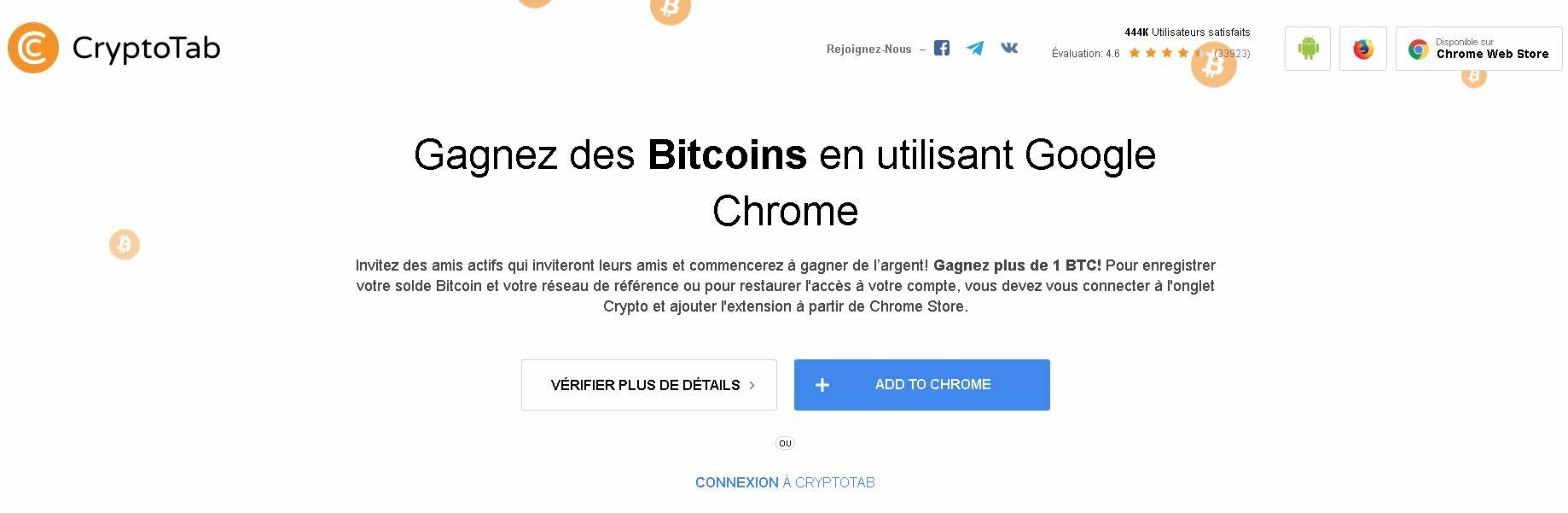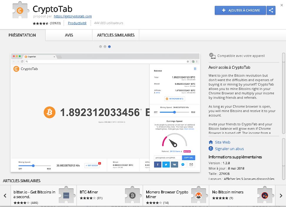CryptoTab est une extension de Google Chrome permettant de miner des Bitcoins. Plus le processeur (CPU) du PC est puissant plus le minage est important. Tant que Chrome reste en fonction il va miner des bitcoins.