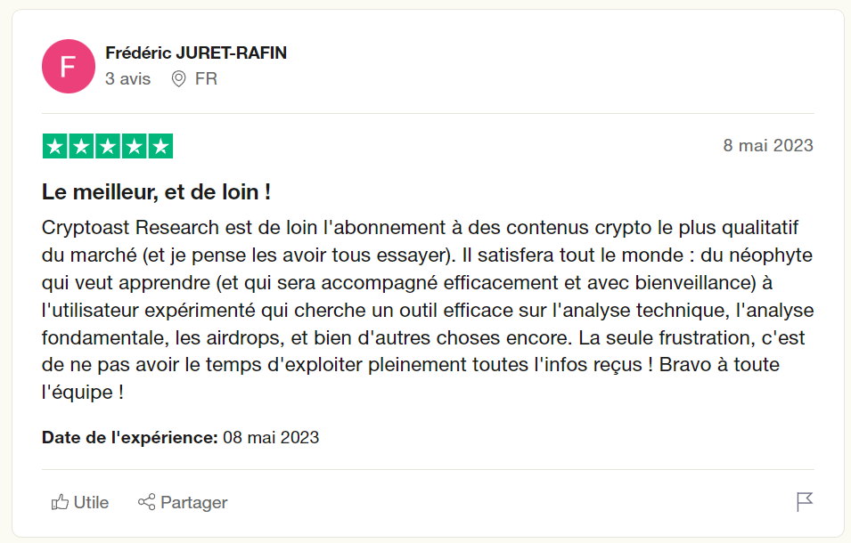 Avec sa bibliothèque de contenus composée de plusieurs centaines d'analyses, vous trouverez forcément votre bonheur sur Cryptoast Research, comme en témoignent les dizaines de témoignages positifs publiés sur Trustpilot par ses membres :