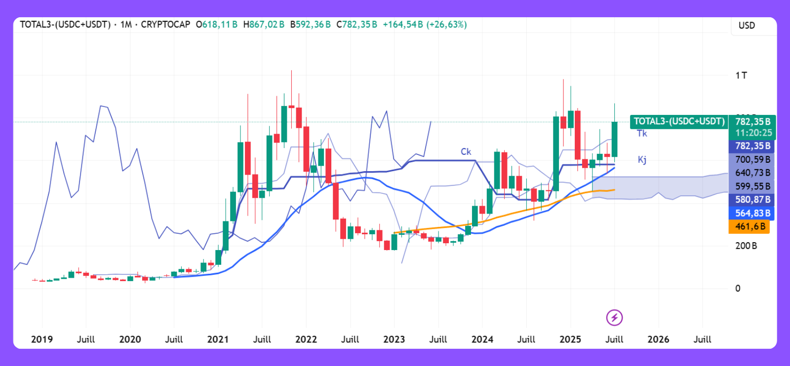Sur cette même période, l'indice du Total 3 affiné a grimpé de plus de 26 %, signe que les altcoins profitent également de cette tendance à la hausse.