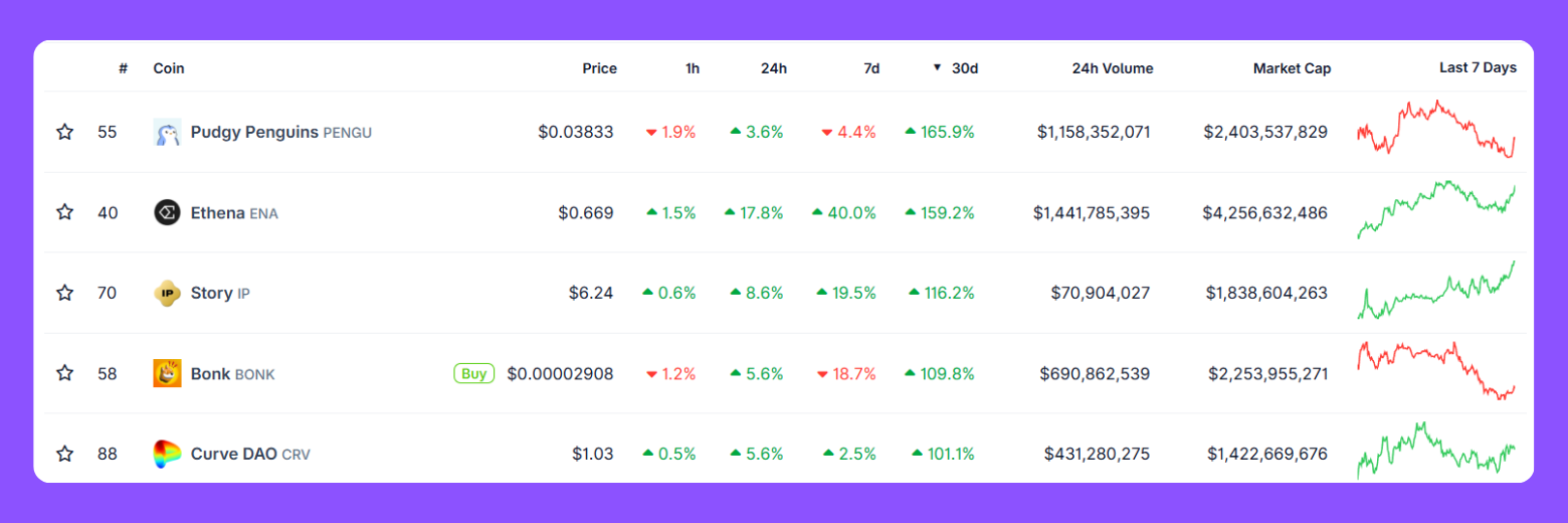 Parmi les cryptos qui ont le plus performé au cours des 30 derniers jours, nous pouvons retrouver le CRV, le BONK, l'IP, l'ENA et le PENGU :