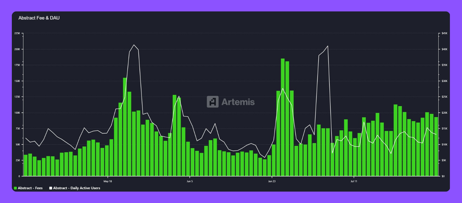 Graphique représentant les utilisateurs journaliers (en blanc) et les frais générés (en vert) sur la blockchain Abstract