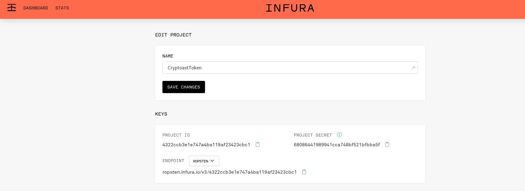 Ensuite, on va utiliser le réseau Ropsten, l'une des blockchains dont je vous ai parlé plus haut, et pour ce faire il va nous falloir une adresse Ethereum. Si vous en déjà une, parfait. Sinon je vous invite à installer Metamask en suivant ce guide. Une fois que c'est fait, rendez vous ici avec votre adresse pour demander quelques ethers de test afin de financer les transactions. Vous êtes en possession de vos ethers ? Continuons donc. Nous allons également travailler avec Infura , qui va nous permettre d'obtenir une clé API pour notre projet afin d'interagir avec la blockchain Ropsten. Connectez-vous au site, et récupérez votre clé API, que nous utiliserons dans les paramètres Truffle par la suite.