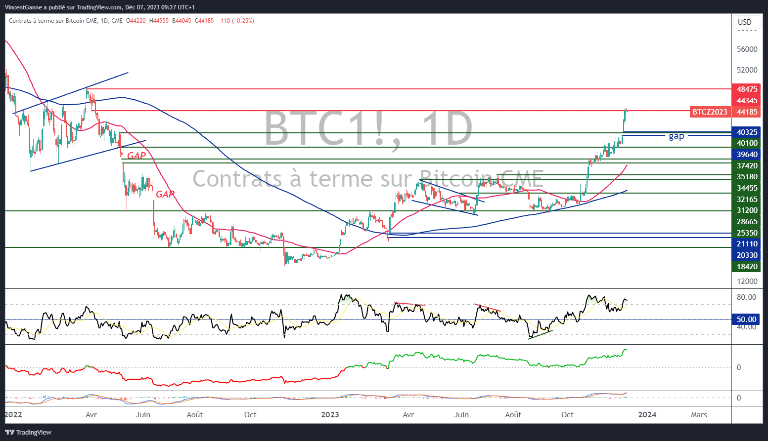 En hausse verticale depuis la fin du mois d’octobre dernier, le cours du Bitcoin (BTC) a fait sauter le verrou des 38 000 dollars à la faveur d’un gap haussier hebdomadaire ouvert en début de semaine. Le BTC joue à plein régime la validation du premier ETF spot début janvier, ainsi qu’un pivot rapide de la FED et de la BCE est attendu au premier semestre 2024.