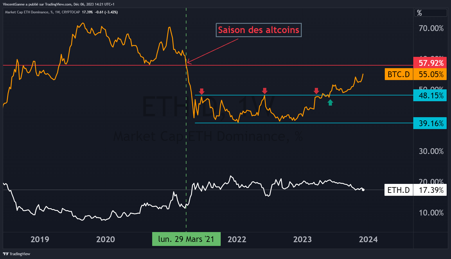 Je pense que ce passage de témoin aura lieu quand la dominance du BTC rejoindra la résistance à 58%, le seuil de décrochage du mois de mars 2021 comme le montre le premier graphique ci-dessous, avec un net rebond de la dominance de Ethereum.