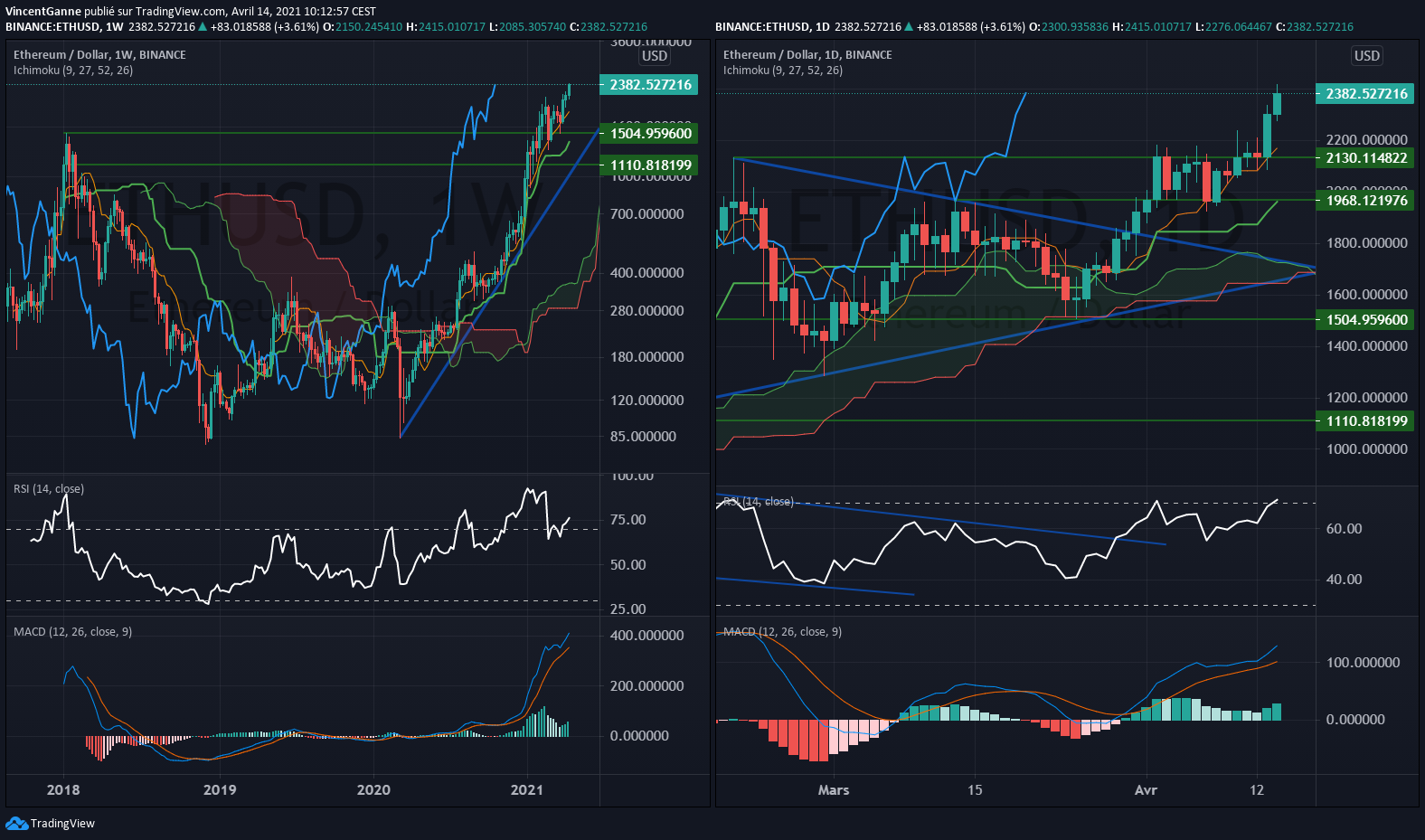 La paire ETH/USD en Weekly (gauche) et en Dail (droite) - Source : TradingView