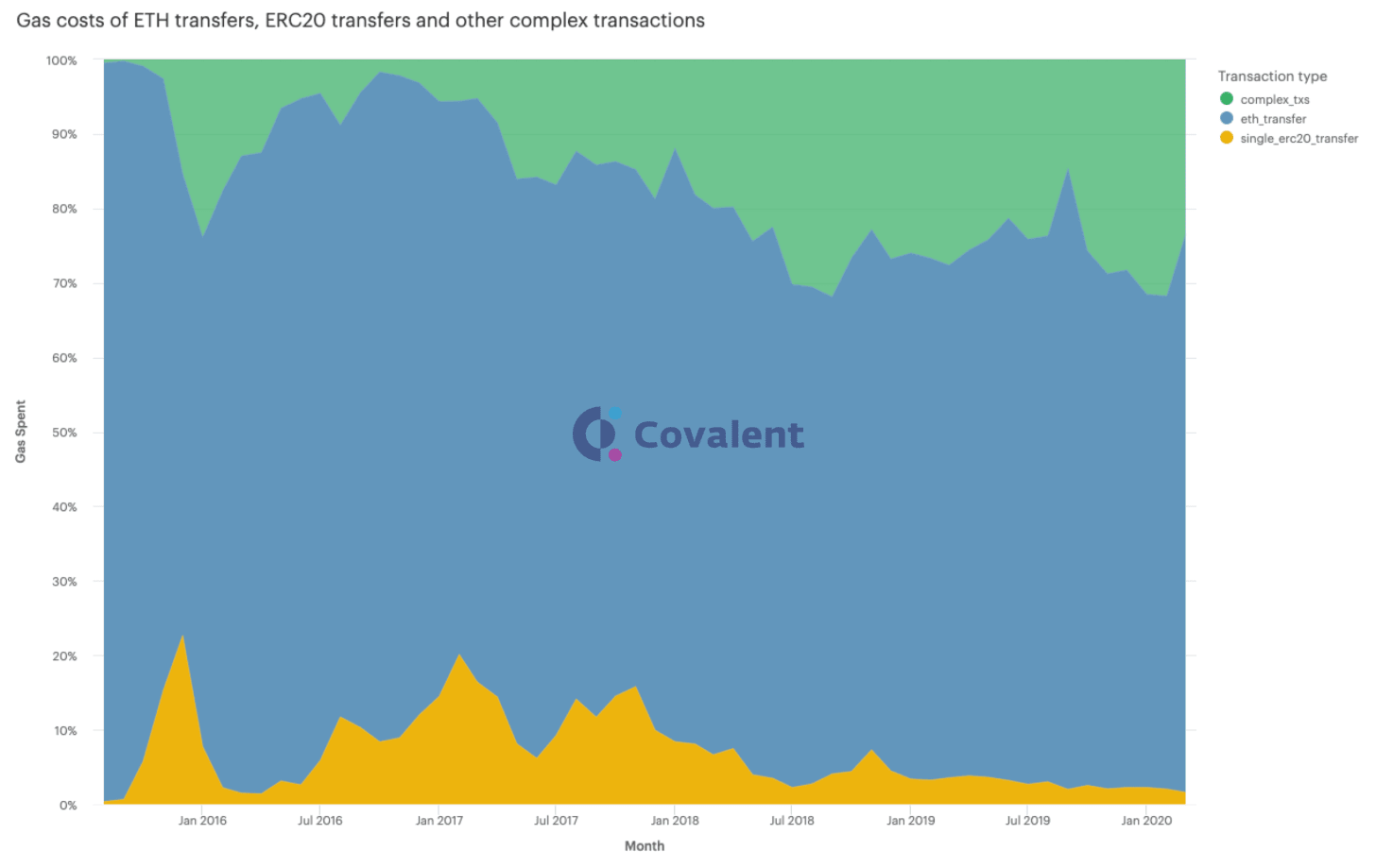 L’auteur de l’analyse, Ganesh Swami, est un Etherophile convaincu, c’est donc sous cet angle qu’il livre cette étude. Elle représente cependant un intérêt pour les agnostiques, car elle montre une réelle évolution d’Ethereum. L’étude sépare les transactions sur le réseau Ethereum en plusieurs catégories : d’une part les transactions « classiques » d’ETH, de l’autre celles qui sont liées à des smart-contracts (les transactions « complexes » souvent originaires de jeux ou de solutions DeFi). Une autre catégorie rassemble les transactions de tokens ERC-20.