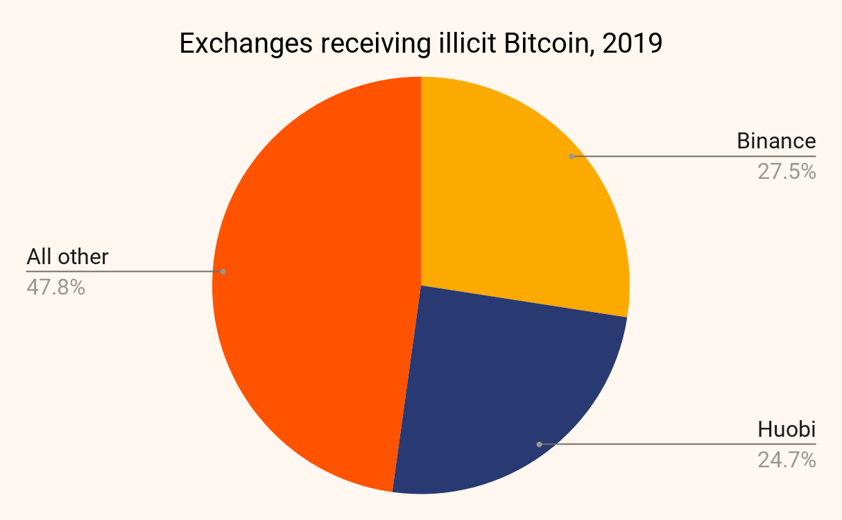 La firme d’analyses Chainalysis a récemment publié une étude sur les BTC illicites, et la manière dont leurs détenteurs essaient de les blanchir. Elle conclut qu'en 2019, 2.8 milliards de dollars ont été envoyés sur les exchanges par des criminels, dont 50% sur Binance et Huobi. Cela met en question l’efficacité des procédures de vérification d’identité pratiquées par les plateformes d’échange.