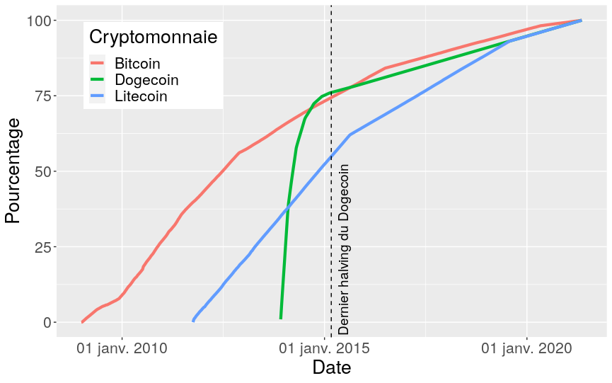Pourcentage de jetons en circulation du Bitcoin, Dogecoin et Litecoin par rapport à leur quantité totale en circulation au 10 mai 2021, d'après les données de Blockchair.