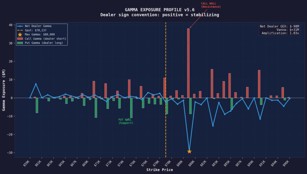 Le seuil des 80000 dollars constitue une résistance technique majeure qui correspond au gap baissier ouvert début février sur le contrat future BTC du CME. Il correspond aussi à une zone de forte concentration d’intérêts sur le marché des options, notamment avec un important call wall qui agit comme une barrière à la progression des prix.