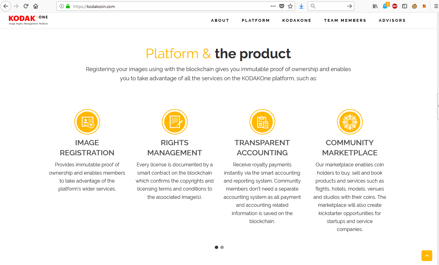 Le 9 janvier 2018 Kodak a annoncé le lancement (avec Wenn Digital) d’une plateforme de gestion des droits d’auteurs sur des photographies grâce à l’utilisation de la blockchain. Cette plateforme fonctionnera avec des KodakCoin, tokens utilisés pour acheter les droits d’utilisation des photographies disponibles sur la plateforme et rémunérer les auteurs.