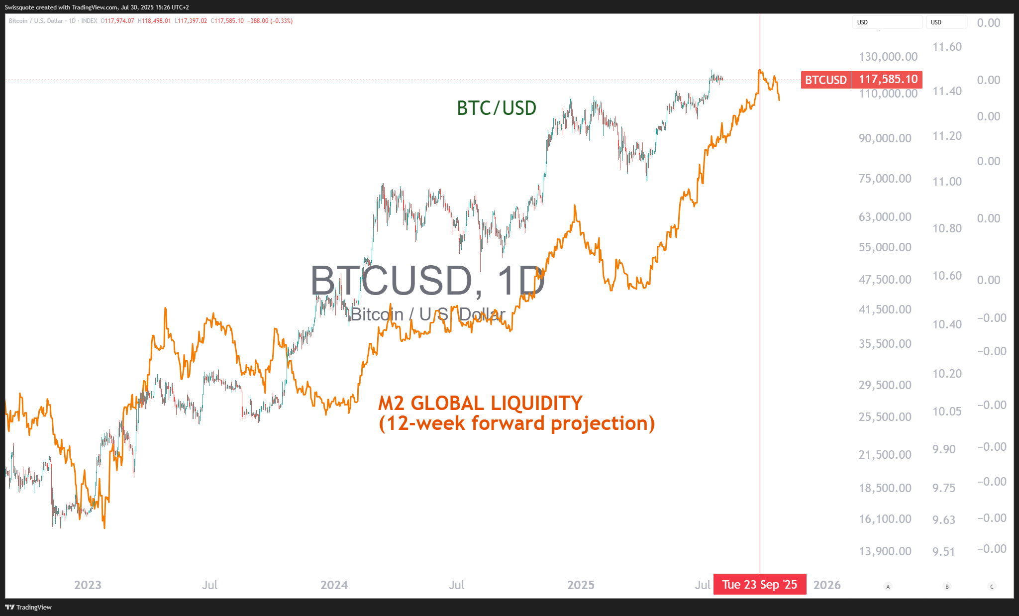 Ce sont les 130 000 dollars qui constituent la cible graphique théorique et un objectif de cours qui devrait être rejoint d’ici la fin de l’été. Notons que le cours du Bitcoin est toujours porté par les nouveaux records de la liquidité mondiale M2 qui sont en faveur d'un mois d'août 2025 haussier.