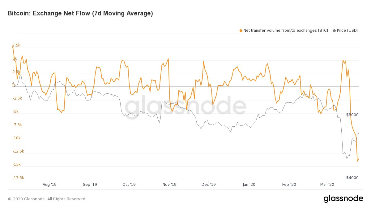 Les recherches de Glassnode montrent que les traders ont déplacé de plus en plus de Bitcoins hors des crypto-bourses comme Coinbase, Bitmex, Kraken ou encore Binance. Cela pourrait être interprété comme un signe que la détention (et non la vente) de BTC est favorisée malgré les conditions de marché actuelles.