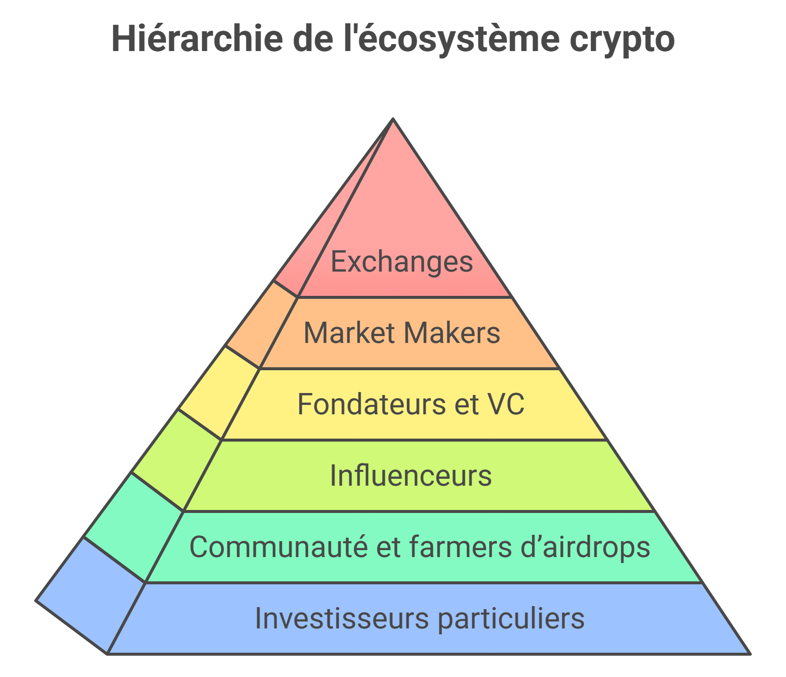 Au bas de la pyramide se trouvent la communauté/les chasseurs d'airdrops, puis les investisseurs particuliers. Les premiers fournissent un travail gratuit (tests, création de contenu, génération d'activité) en échange d'allocation de tokens souvent dérisoires. Les derniers constituent idéalement la liquidité de sortie pour tous les niveaux supérieurs.