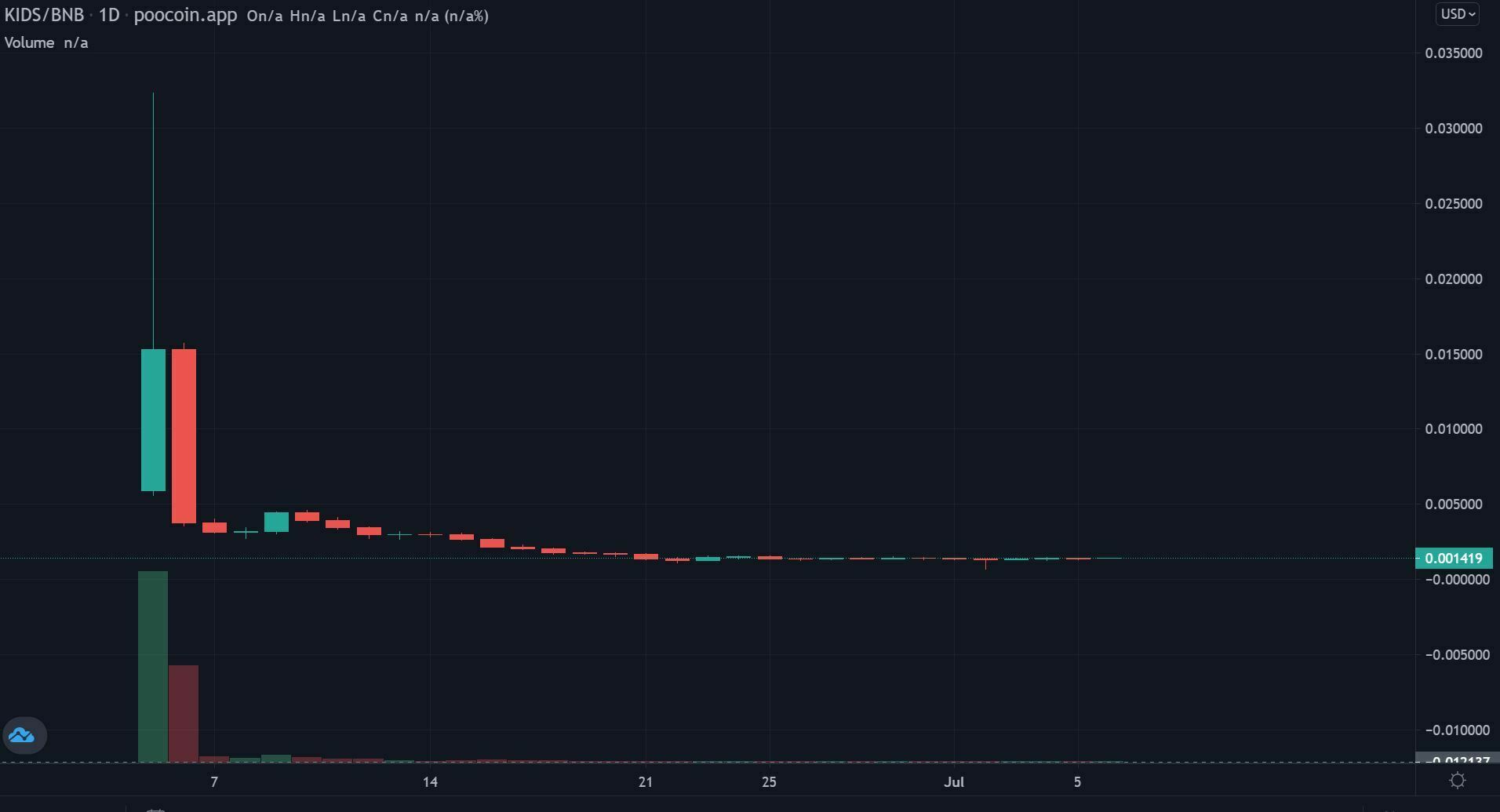 Cependant, après la sortie publique du projet sur la plateforme décentralisée PancakeSwap, le prix du KIDS a dégringolé de près de 90% en trois jours seulement.