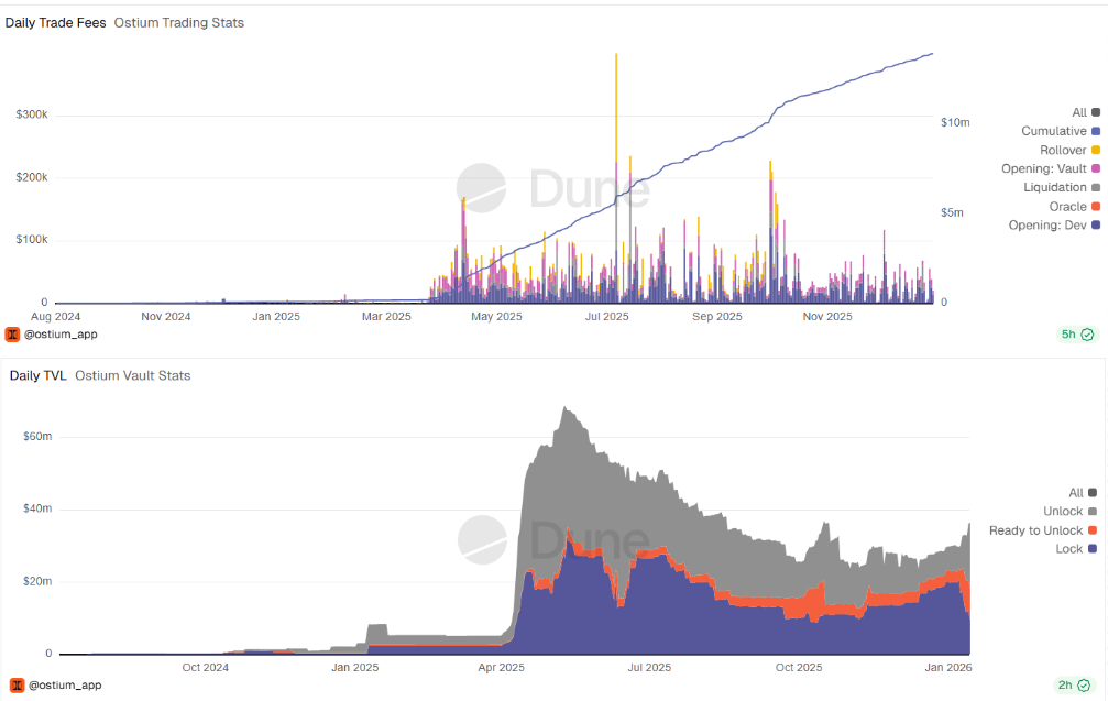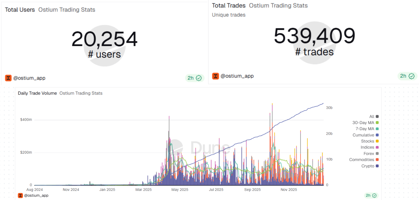 En regardant les dashboards dédiés à Ostium disponibles sur Dune, on peut en tirer deux conclusions :