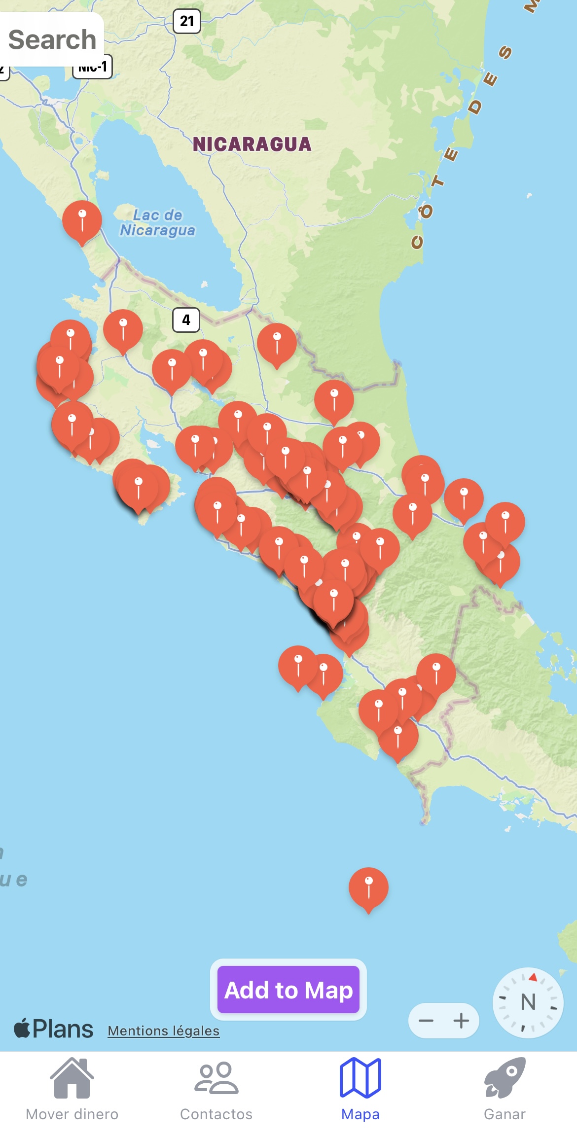 Carte disponible sur l'application Bitcoin Jungle montrant les commerces acceptant le Bitcoin comme moyen de paiement au Costa Rica