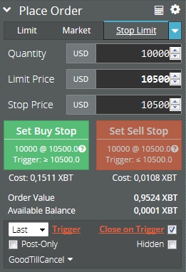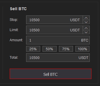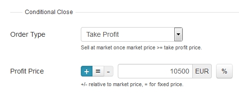 Exemple : J'ouvre une position de 1 Bitcoin à 10.000€/BTC. Je place en même temps un Take Profit à 10.500€. Si le prix atteint 10.500€, ma position va se fermer automatiquement, j'aurai réaliser un bénéfice de 500€.
