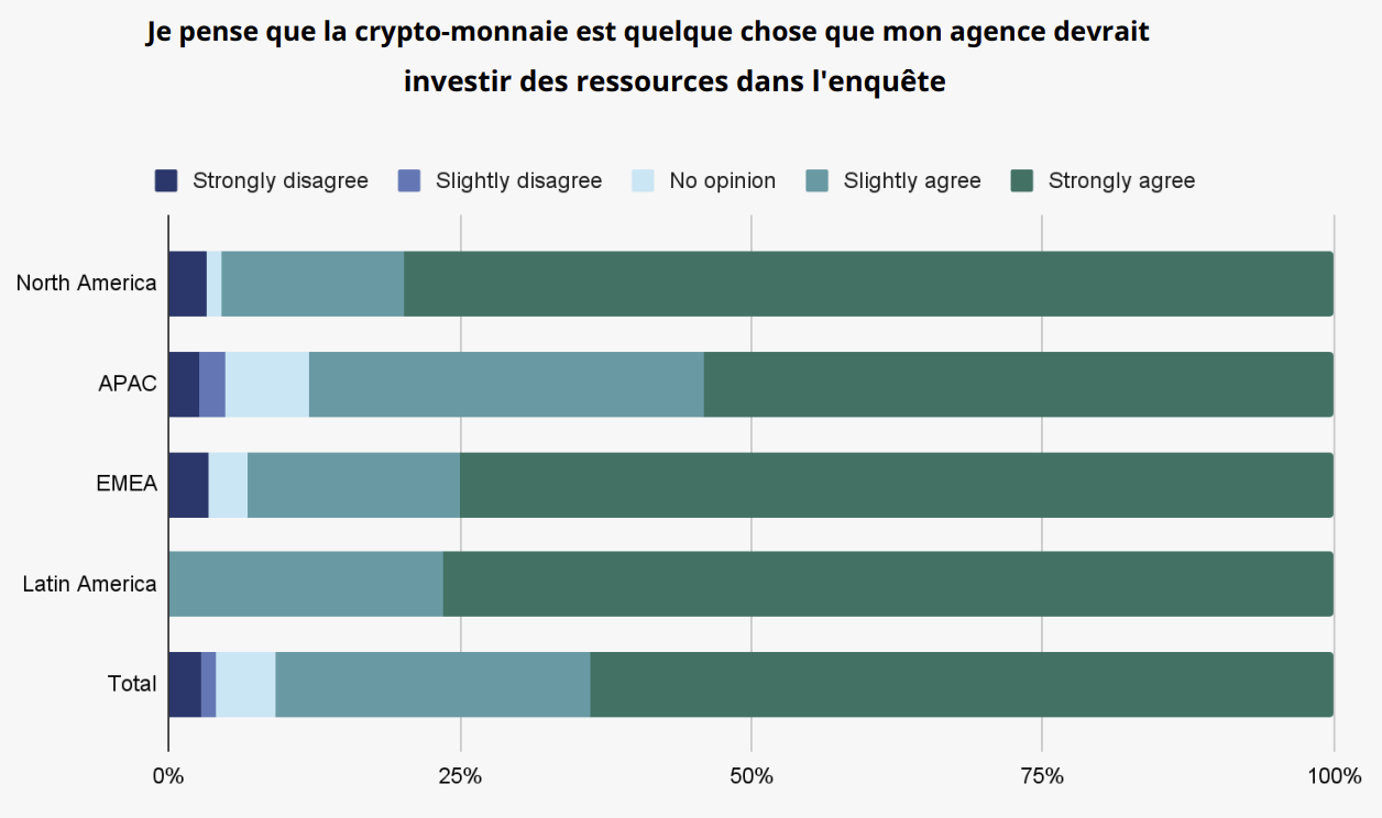 Malgré ces sentiments plutôt personnels, la très grande majorité des répondants font preuve de pragmatisme en s'accordant sur le fait que les cryptomonnaies sont un sujet pertinent pour les enquêtes et qu’il faut investir davantage de ressources pour développer des capacités d’enquêtes plus importantes dans ce domaine.