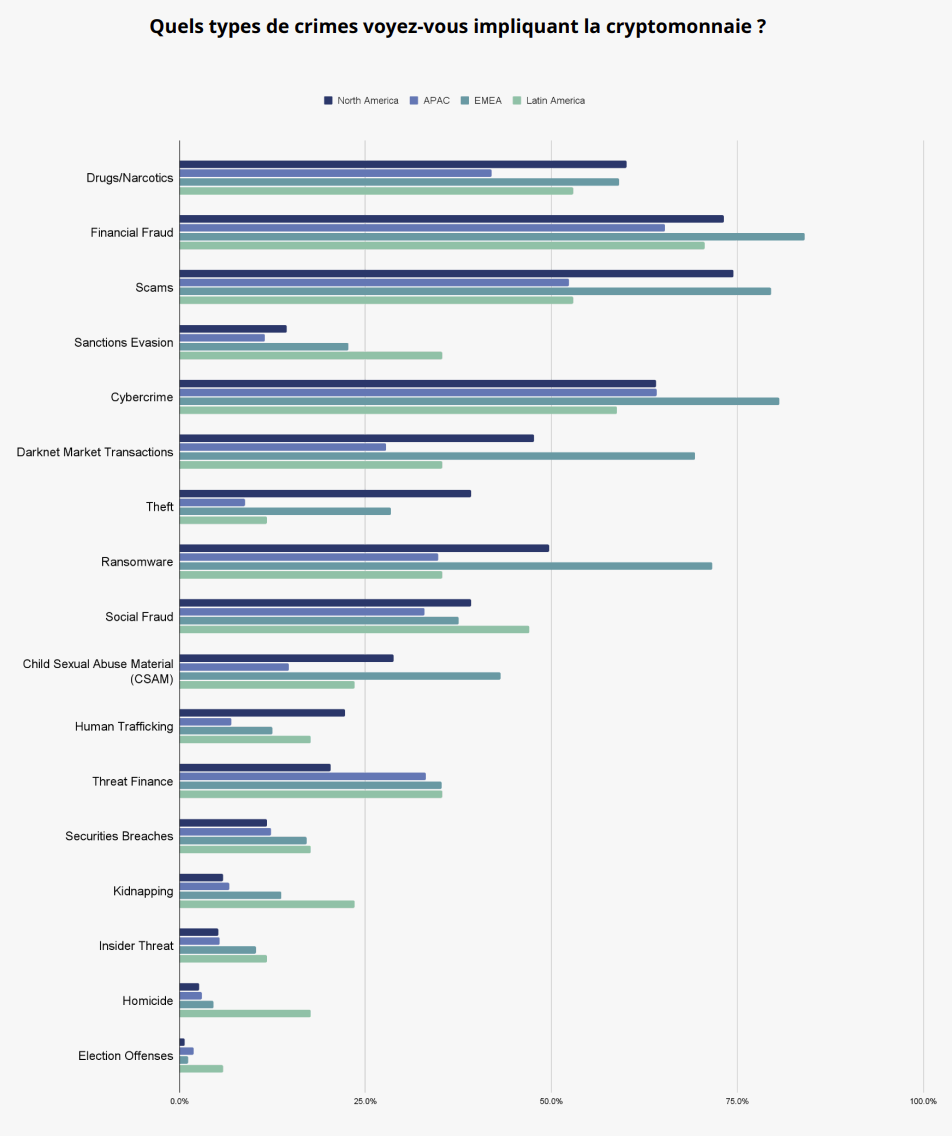 En Amérique du nord et en Europe, ce sont les fraudes, les escroqueries et la cybercriminalité qui ressortent le plus. Alors qu’en Amérique latine, compte tenu du paysage socio-économique (inflation et instabilité monétaire), il y a un usage illicite plutôt lié à la fraude aux avantages fiscaux, aux violations des valeurs immobilières ou encore dans le cadre d’homicides ou de délits électoraux.