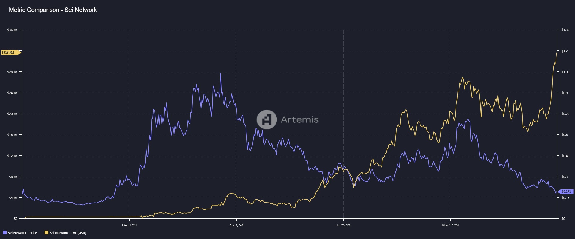 Graphique représentant l'évolution de la TVL (en jaune) et le prix du token SEI (en bleu)