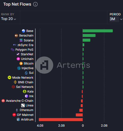 Sei fait également partie des rares blockchains à attirer plus de capitaux entrants que de sortants, avec un résultat net de 24,2 millions de dollars selon les données d'Artemis Terminal :