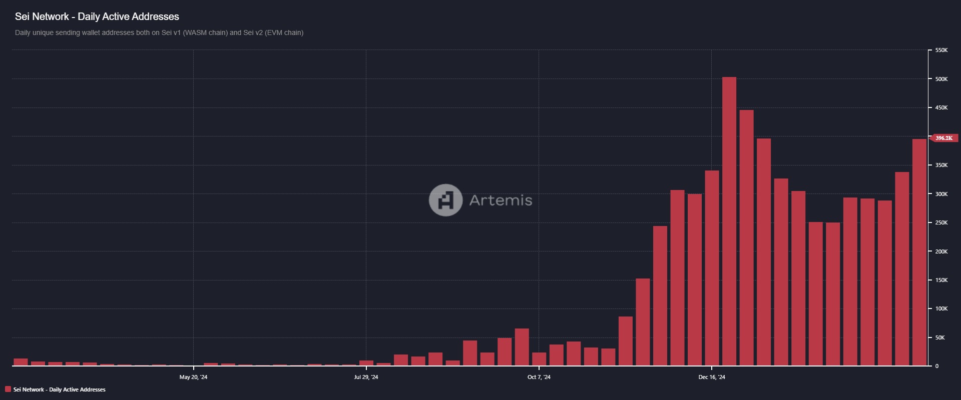 Depuis cette mise à jour, le nombre d'adresses actives sur la blockchain Sei a explosé, dépassant les 500 000 sur la 3e semaine de décembre. La semaine dernière, près de 400 000 adresses actives ont été recensées :