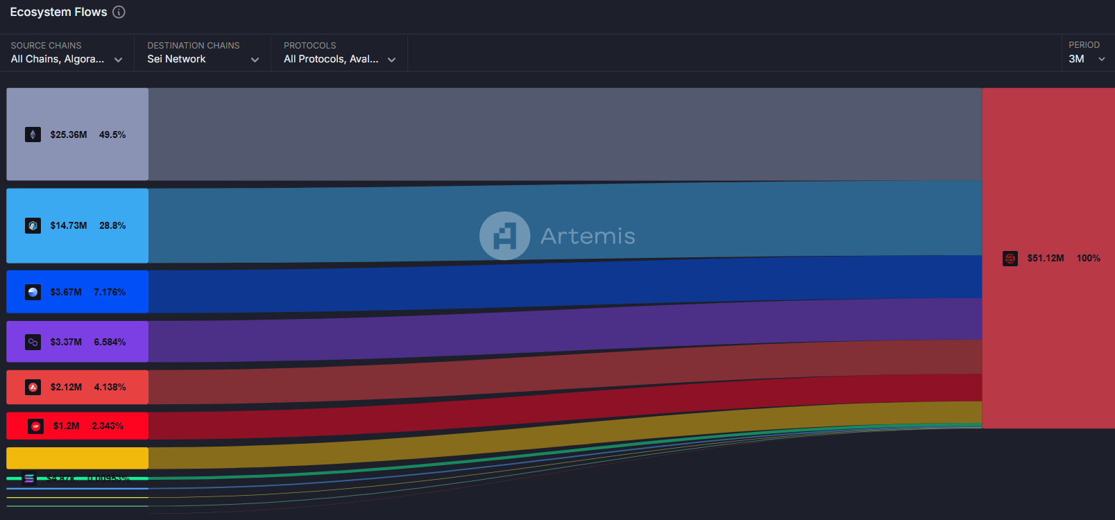En observant plus en détails les provenances des entrées de capitaux sur la blockchain Sei sur la même période, nous pouvons remarquer qu'une écrasante majorité des inflows sont attribués à l'écosystème Ethereum : 49,5 % pour le layer 1 Ethereum, 28,8 % pour Arbitrum, 7,2 % pour Base et 2,3 % pour Optimism.