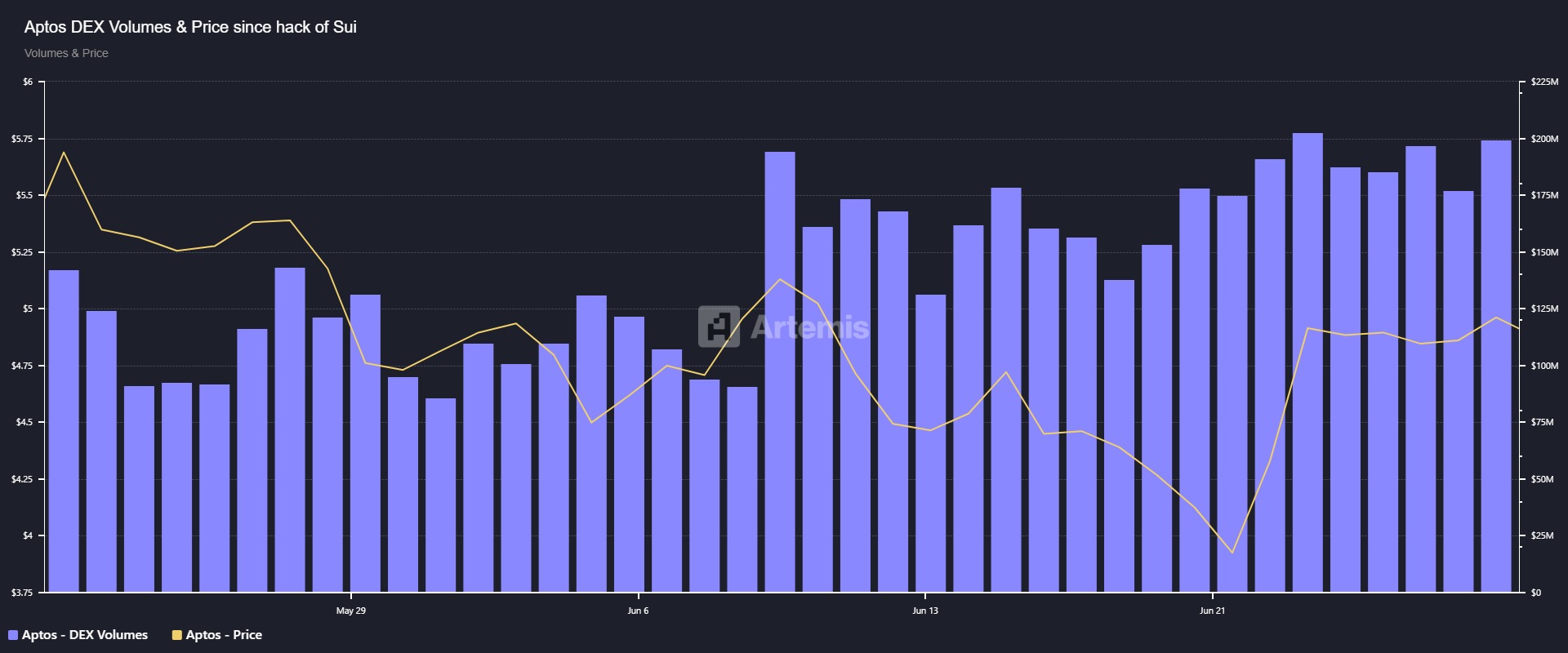 Il semble que le hack de Sui ait bénéficié à son principal concurrent. Les volumes sur les DEX d'Aptos ont augmenté de plus de 40 % depuis cet événement :