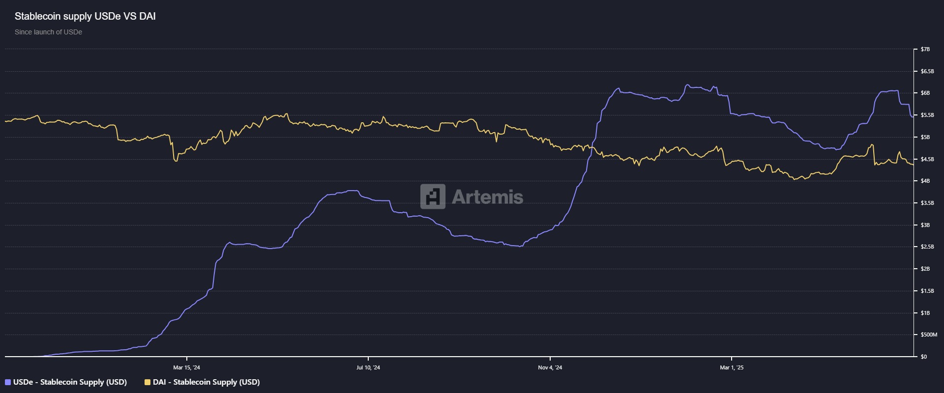 Lancé en novembre 2023, le stablecoin USDe représente désormais environ 2,3 % de parts de marché des stablecoins, en termes de capitalisation. À titre de comparaison, le DAI, précédemment 3e sur cette même métrique, représente actuellement 1,8 % de parts de marché.