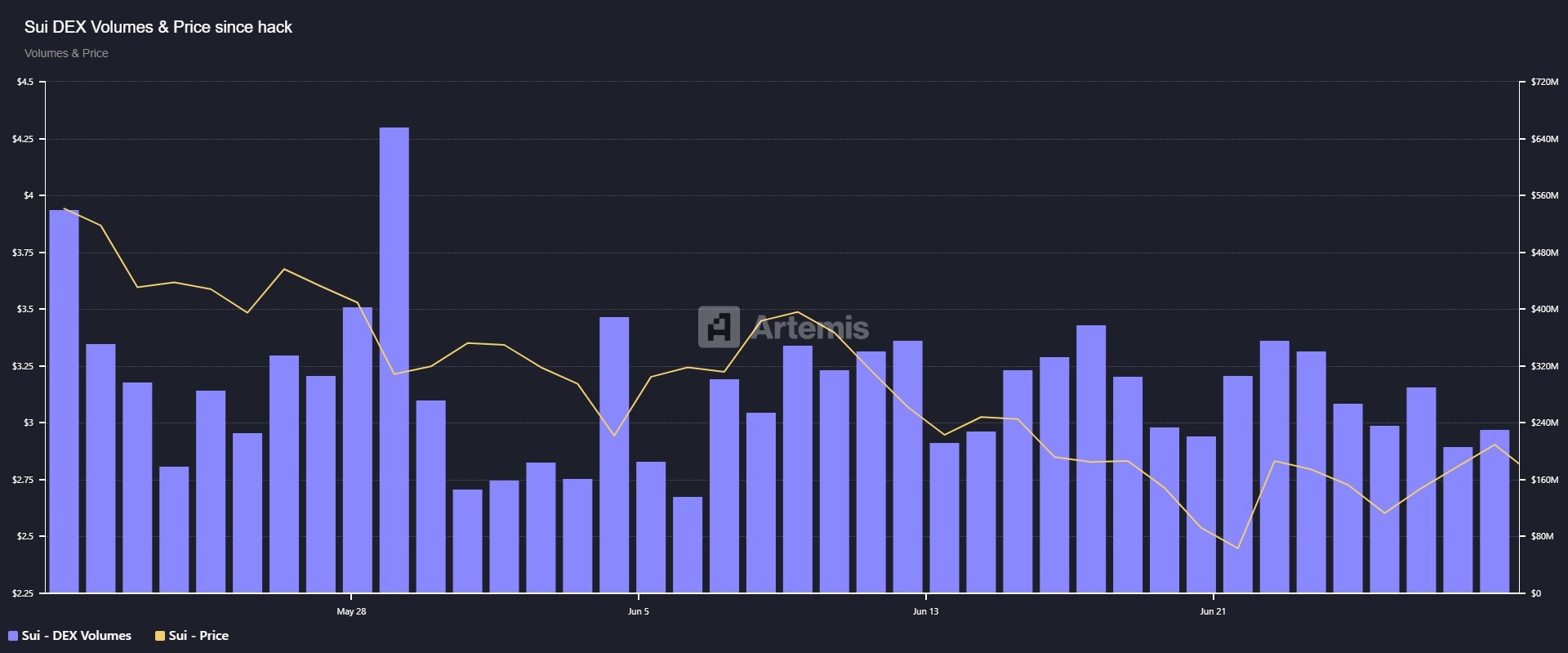 Cette crise de confiance se ressent particulièrement dans de nombreuses données on-chain de Sui. Par exemple, depuis le hack de Cetus, les volumes sur les exchanges décentralisés (DEX) de Sui ont chuté de 57,1 % selon les données d'Artemis Terminal :