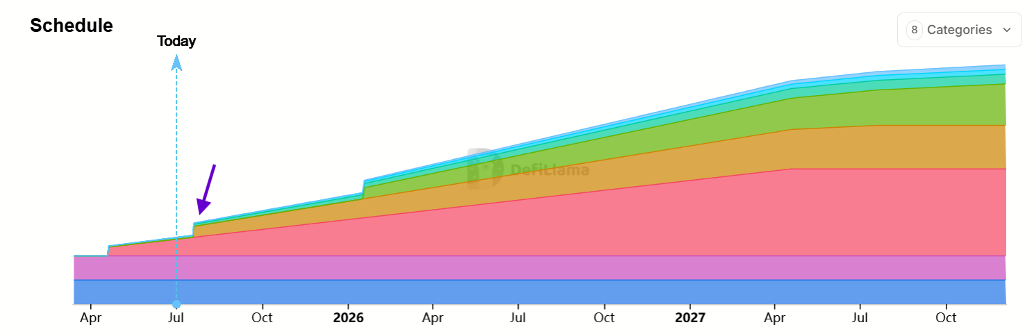Le TRUMP sera le plus important unlock du mois de juillet. Plus de 445 millions de dollars seront libérés le 19 juillet. Outre cet unlock exceptionnel, environ 3,45 millions de tokens TRUMP sont libérés chaque mois (à un rythme quotidien), ce qui représente 32 millions de dollars :