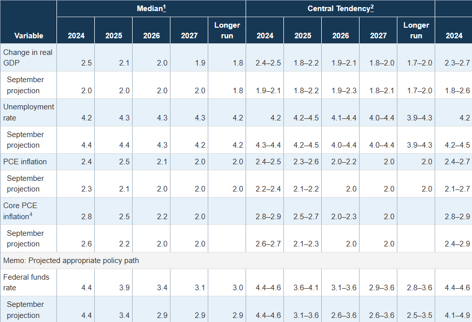 - Taux d’intérêt des fonds fédéraux: la Fed envisage seulement 2 baisses de taux pour l’année 2025 avec une pause en début d’année, le temps d’obtenir confirmation de la reprise de la désinflation aux États-Unis ;