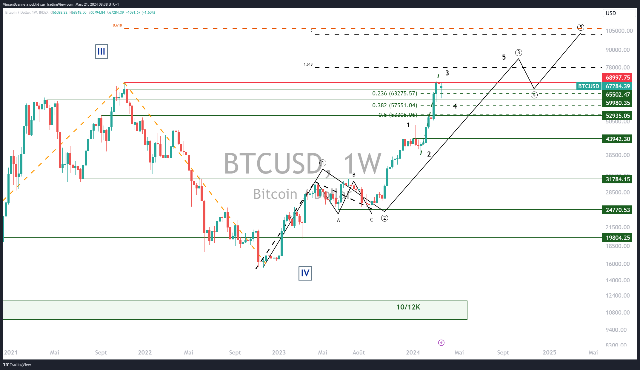 C’est la résistance à 69 000 dollars qu’il faut déborder à nouveau pour relancer la tendance haussière de fond du BTC.