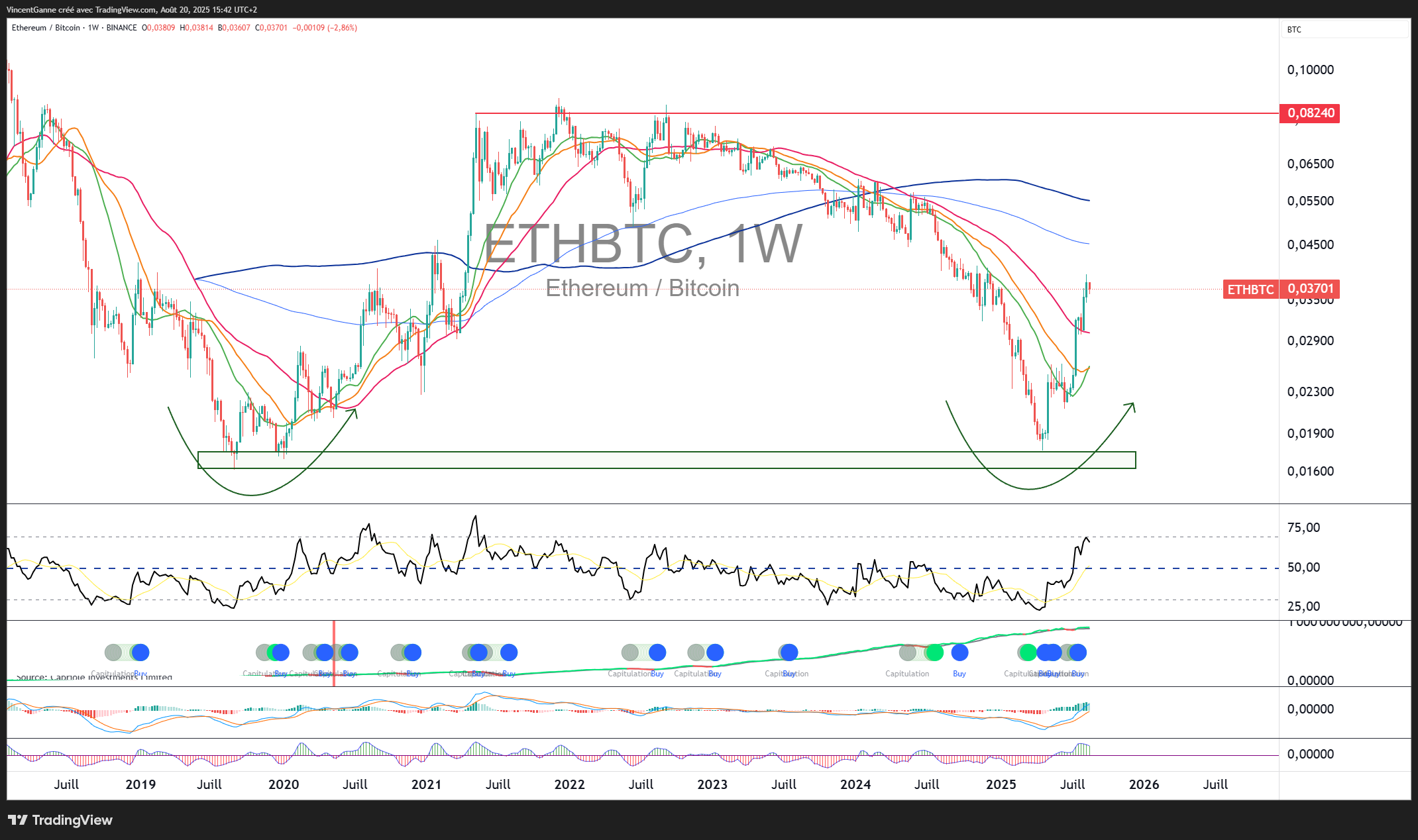 L’autre signal encourageant provient du ratio ETH/BTC. Celui-ci s’est retourné à la hausse après un rebond sur une zone technique majeure, traduisant une surperformance claire de l’Ether face au bitcoin. Selon l’analyse graphique, ce potentiel de rattrapage est loin d’être épuisé, ce qui laisse envisager une continuation de cette dynamique relative dans les mois à venir.