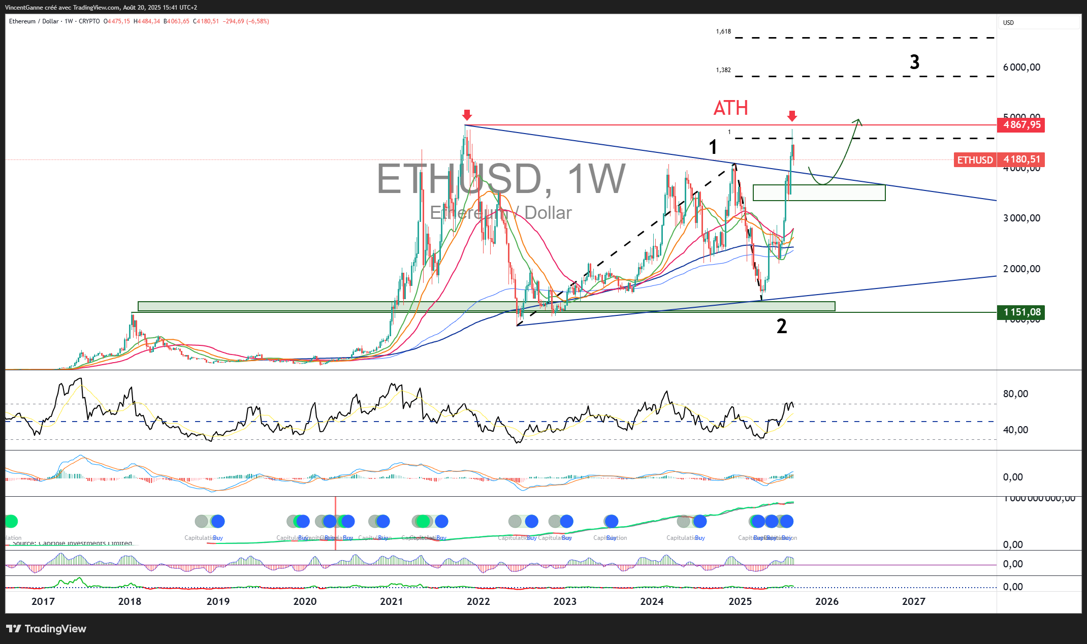 La zone support à surveiller se situe entre 3 500 dollars et 4 100 dollars pour ETH/USD ; c’est ici que le retracement peut devenir une opportunité car ETH en a encore sous le pied pour la fin du cycle.