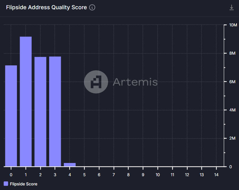 En effet, comme nous pouvons le constater sur le graphique ci-dessous, la blockchain Aptos détient un grand nombre d'adresses avec un score Flipside élevé :