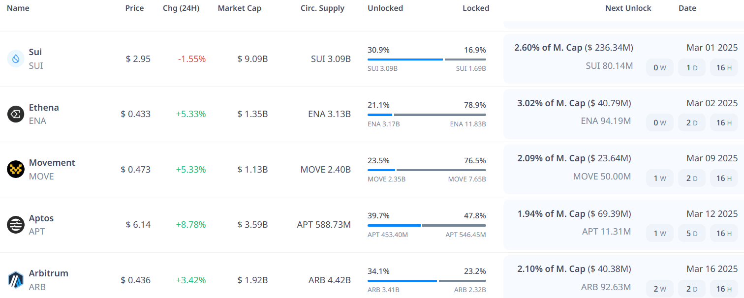 Bien que l'unlock de Solana soit le plus important du mois de mars, d'autres libérations seront à surveiller, notamment pour les tokens SUI, ENA, MOVE, APT et ARB :