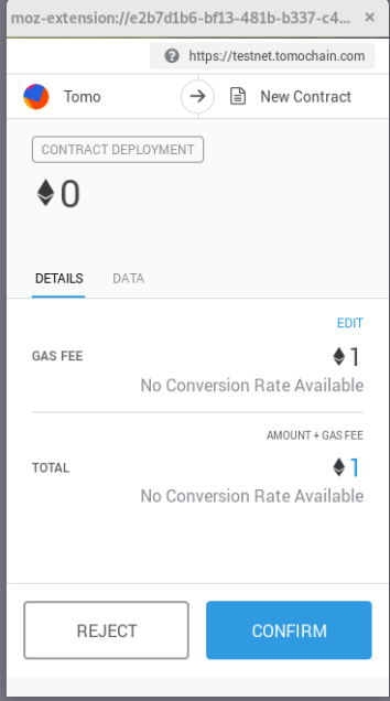 J’ai utilisé Metamask pour me connecter au site, j’ai donc une pop-up de ce dernier pour me permettre de confirmer la transaction. Même si l’affichage montre des frais d’un Éther, c’est bien un TOMO que je vais payer pour cette transaction.