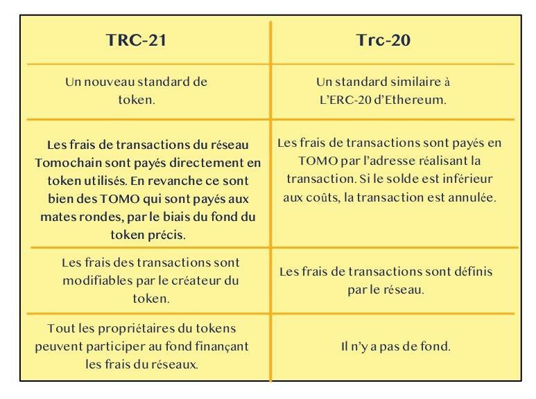Voici un tableau récapitulatif des différences entre le token TRC-21 et TRC-20, sachant que le TRC-20 est un clone du standard ERC-20 appliqué au réseau Tomochain. On remarque que ce sont deux tokens très différents, et que leurs utilisation semble complètement distinctes. Mais en réalité le token TRC-21 peut tout a fait remplacer le standard TRC-20 dans toutes les situations. En effet le standard TRC-20, inspiré du ERC-20 d'Ethereum est un token tout a fait simple qui permet d'échanger de la valeur dans la plupart des applications et protocoles de l’écosystème. Le TRC-21 est donc un ajout au token le plus utilisé et tend à devenir le nouveau standard général pour les applications décentralisées.