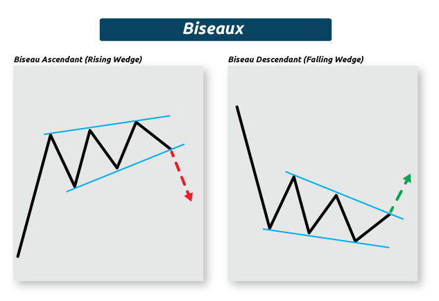 Le biseau (wedge) se forme dans la continuité de la tendance. On retrouvera le biseau ascendant en haut d’une tendance haussière et le biseau descendant en fin de période baissière. Le biseau illustre un ultime effort des acteurs et est souvent synonyme de retournement.