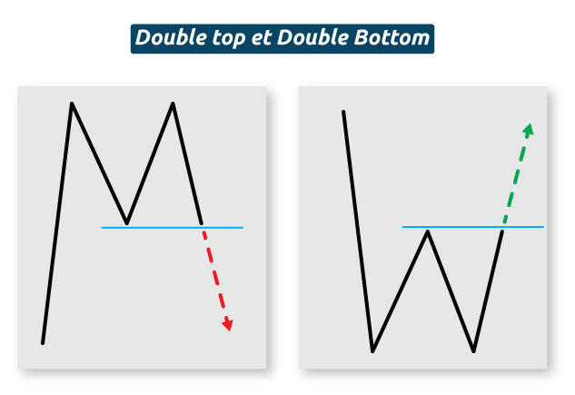 Le double top intervient suite à une tendance haussière et le double bottom en fin de tendance baissière. C’est aussi une figure de renversement puisqu’elle indique qu’on a atteint la limite de la tendance actuelle. En effet, les acteurs viennent alors toucher 2 fois la même ligne sans la casser, ce qui tend à montrer que le mouvement s’affaiblit.