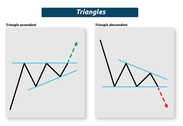 Le triangle est une figure de continuation. Le prix marque un arrêt dans son mouvement mais seulement pour repartir de plus belle. Le triangle est caractérisé par une ligne de tendance horizontale et une en biais.