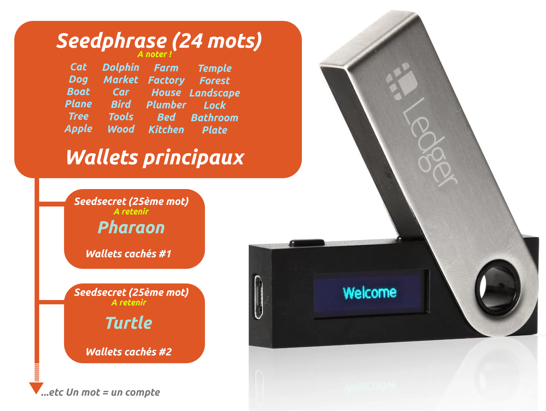 - Paramétrer un second code PIN, qui au lieu de protéger votre seedphrase principale protègera [votre seedphrase + un 25ème mot de votre choix] que vous pourrez rentrer à la place de votre code pin principal quand vous utilisez votre Ledger, et qui vous donnera accès à une autre session, qui contient ses propres wallets. Personne ne peut savoir que vous avez un deuxième PIN/session !