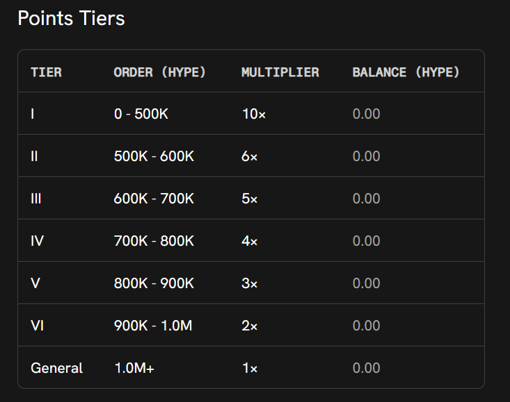 Les multiplicateurs varient selon les tiers, eux-mêmes déterminés par le montant total déposé dans le pool : lorsque la TVL HYPE était encore basse (moins de 500k), les early farmers bénéficiaient d'un multiplicateur pouvant atteindre 10x. Aujourd'hui, les tiers évoluent avec la TVL, mais rester dans les paliers supérieurs reste l'une des stratégies les plus rentables du programme.